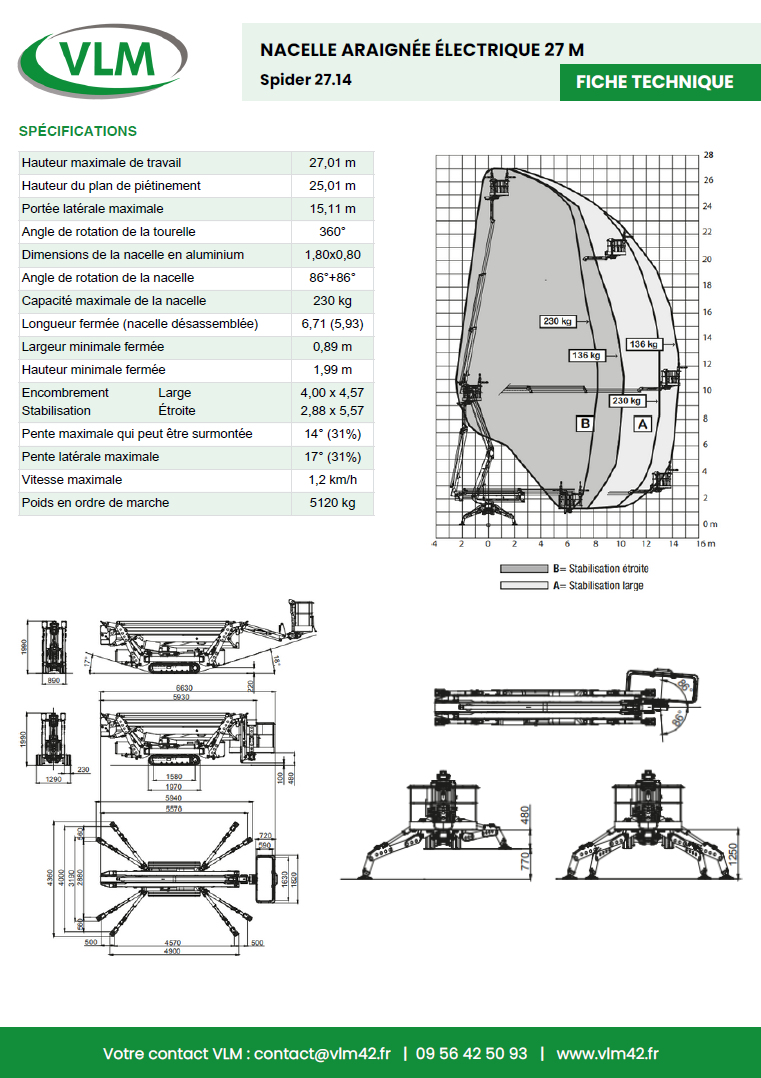 Atteignez les sommets, même dans les accès les plus étroits. Compacte et ultra-polyvalente, la nacelle araignée Spider 27.14 permet de travailler jusqu’à 27 mètres de hauteur avec une portée latérale de 15 mètres, tout en passant par une porte standard grâce à sa largeur de seulement 88 cm.