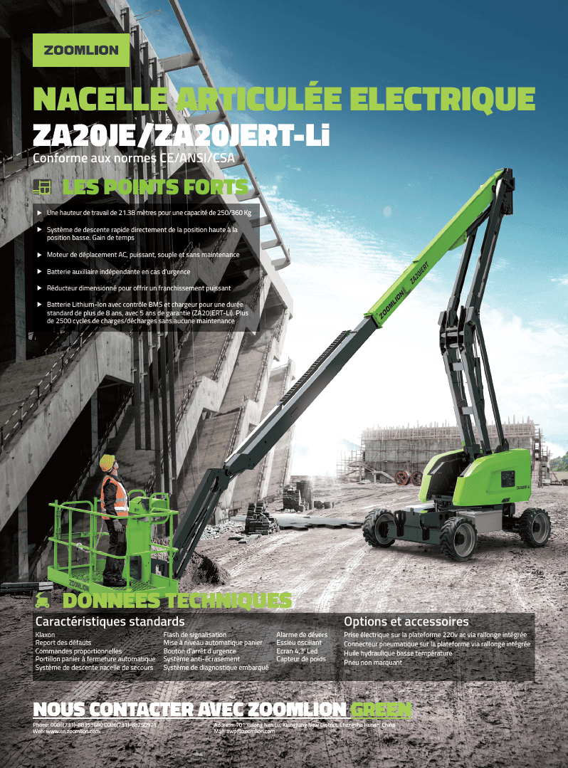 La nacelle articulée électrique Zoomlion ZA20JERT-Li vous permet d’atteindre jusqu’à 22 mètres de hauteur avec une grande souplesse de mouvement grâce à son bras articulé. Idéale pour les travaux extérieurs, la maintenance, ou les interventions en zone difficile d’accès, elle offre un excellent compromis entre portée et facilité d'utilisation.